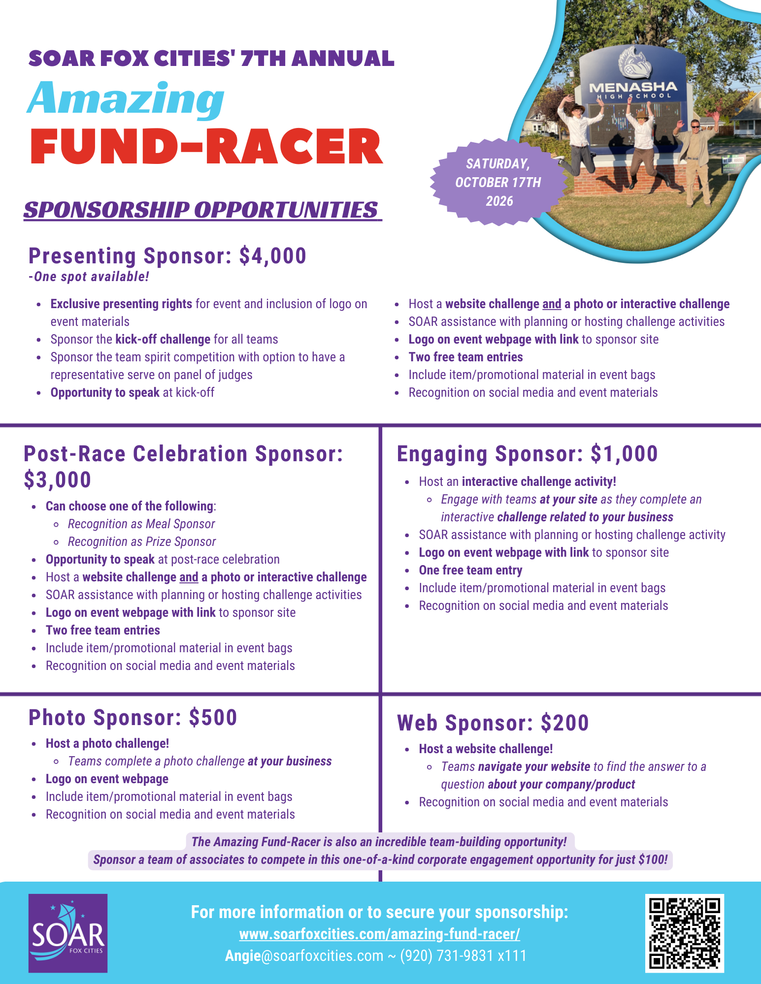 Several different event sponsorship opportunities are available starting at $200. Each sponsorship package provides opportunities for recognition, company visibility, and additional benefits listed below. The funds raised from this community event will benefit SOAR Fox Cities and help empower people with differing abilities. Thank you for your consideration of our event sponsorship opportunities!